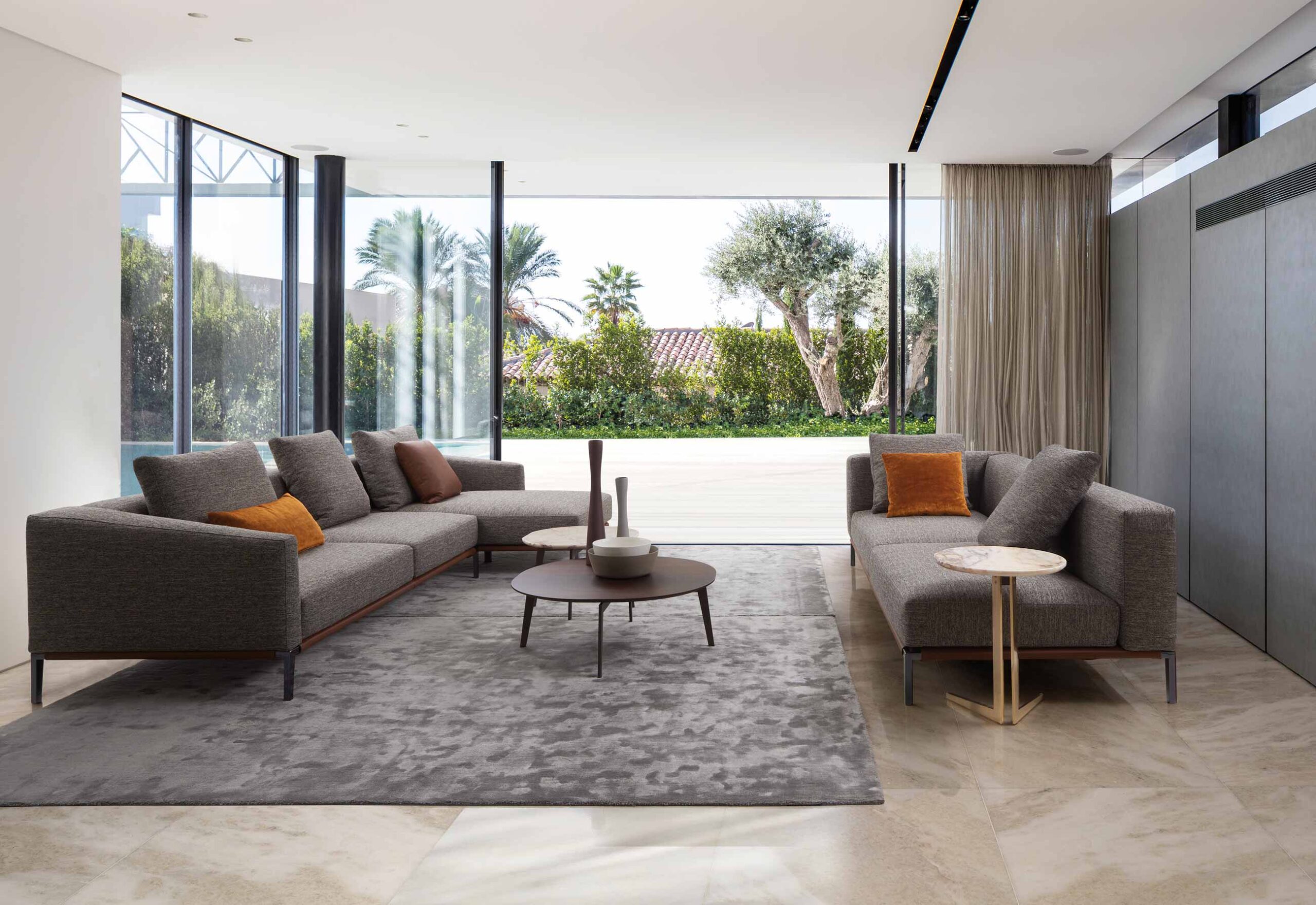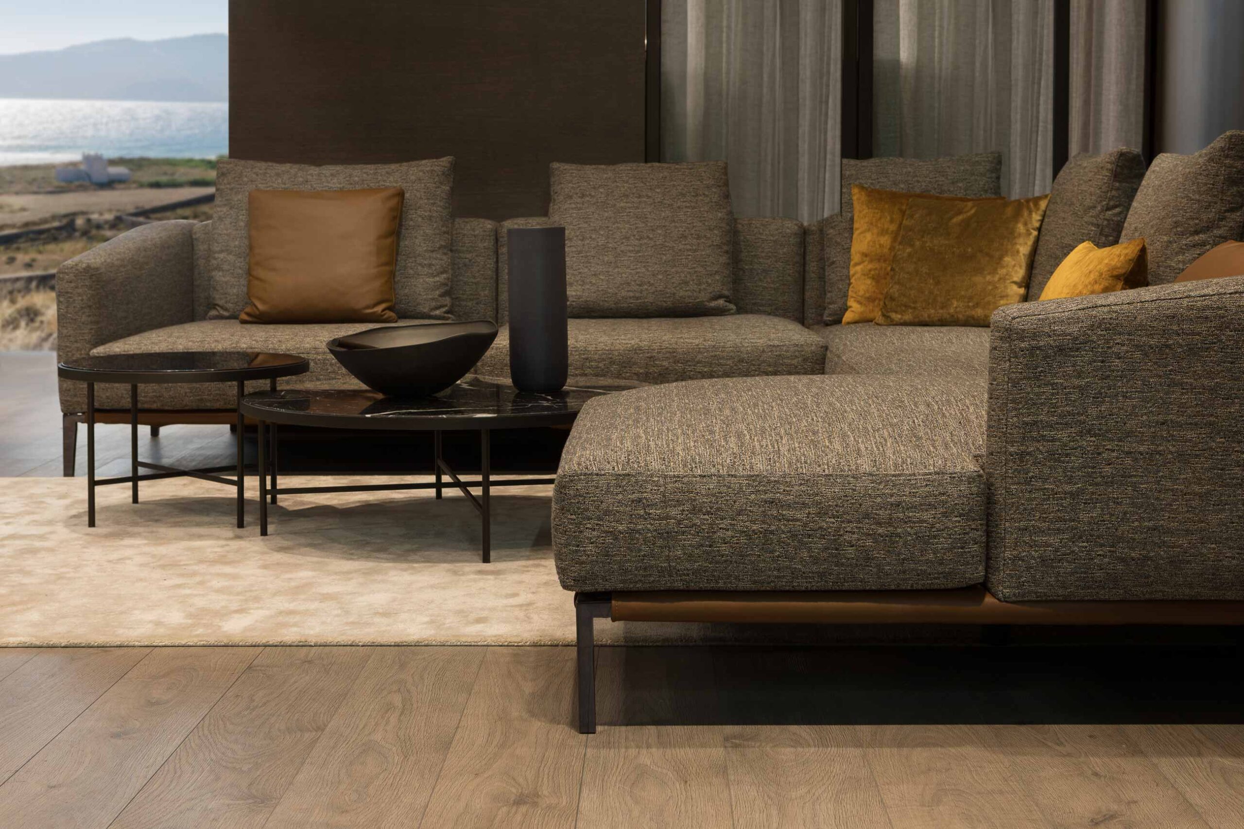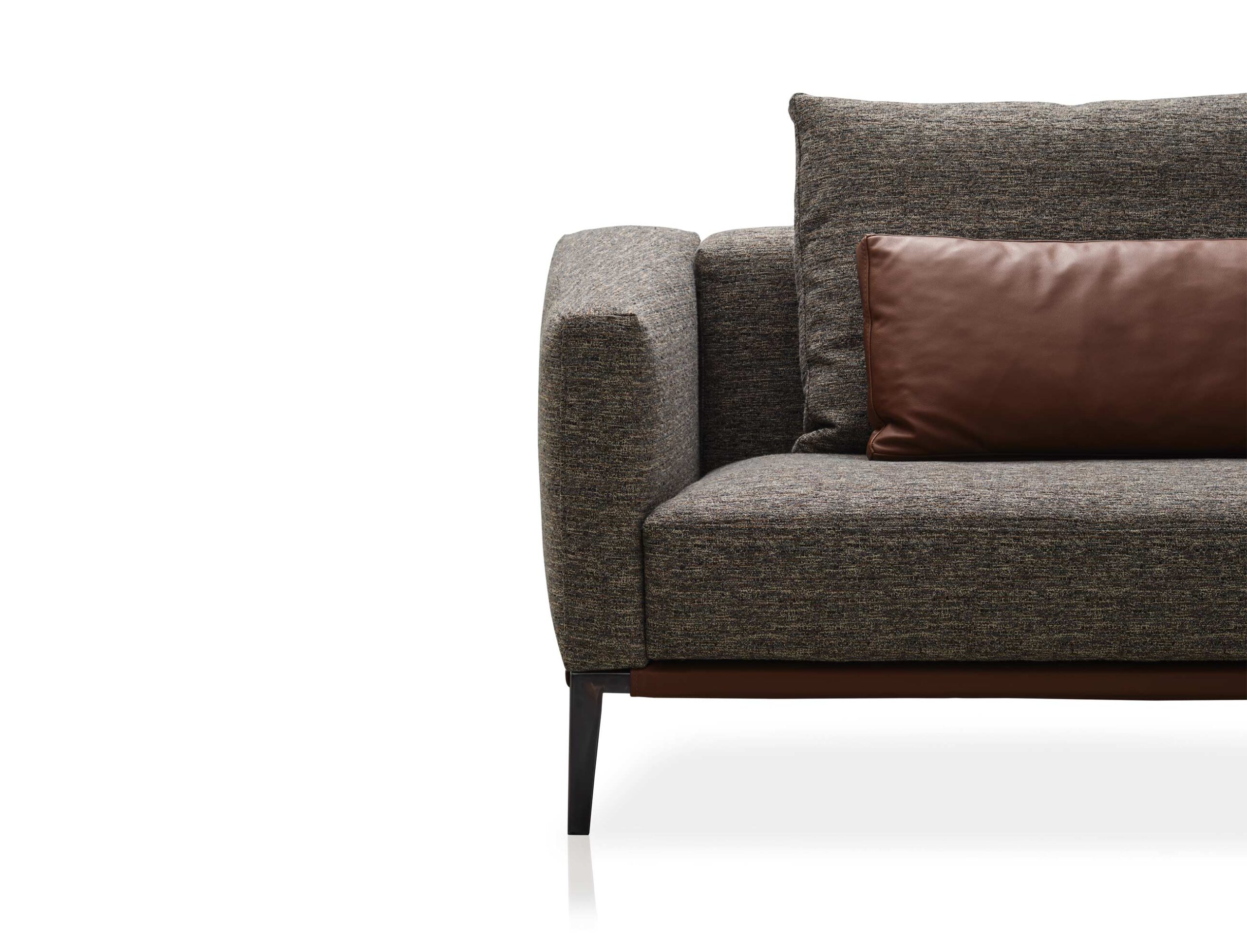 Pace, is a collection of sofas designed to recreate the dynamic atmosphere that inspired its name. The collection consists of several components such as sofas, daybeds, poufs and other elements of every type devised to compose almost every singe configuration. Extremely versatile, just like a close-fitting or loose garment, ideal for the city and for a holiday, warm or light-weight, suitable for every situation, whether in summer or in winter, in Mallorca or in Manhattan. Metal feet in Black Chrome. Base may be produced in contrast leather or same finish as the rest of the sofa.